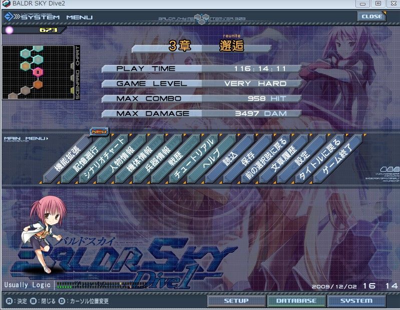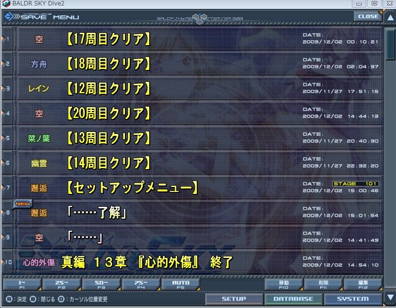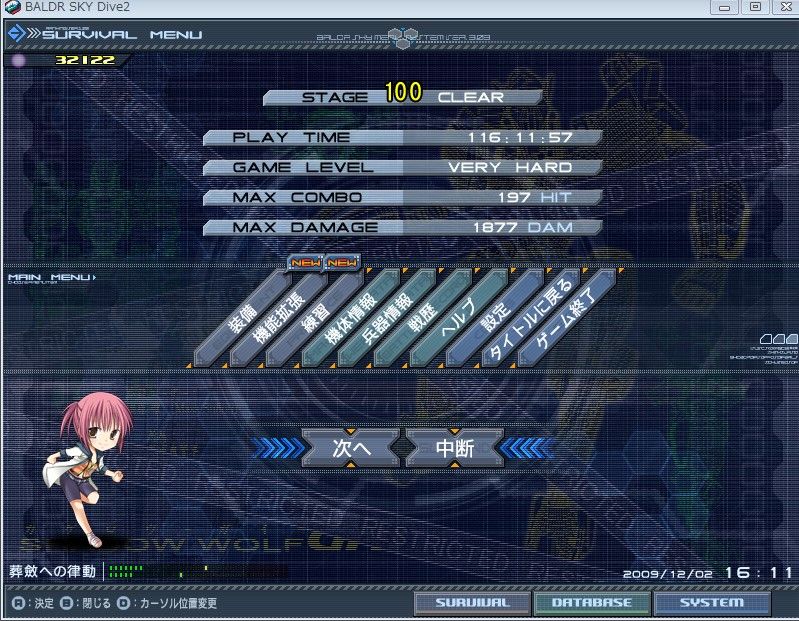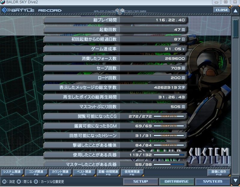 2009年12月02日 バルスカ中毒 俺のバルスカの旅は終わった<挨拶 (c)戯画 こんな感じ。プレイ時間が気持ち悪いことになってる。 というわけで一応ひと段落したので、バルスカは当分封印。 次は紫電か村正あたりを崩しますか。
